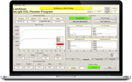 Diseñados exclusivamente para los dosímetros Inlight. En el proceso de lectura, el lector utiliza una luz emitida por un conjunto de diodos (LEDS), esta luz estimula el óxido de aluminio y el haz de luz resultante emitido por el material detector es leído por un tubo photomultiplicador que usa un sistema contador de photones altamente sensible. La cantidad de luz emitida durante la estimulación óptica es directamente proporcional a la dosis absorbida. Este proceso dura segundos y se utiliza una fracción de la energía contenida en el material detector (AI2O3), dando lugar a la capacidad de reanálisis. Con esta técnica se pueden leer altas y bajas energías.